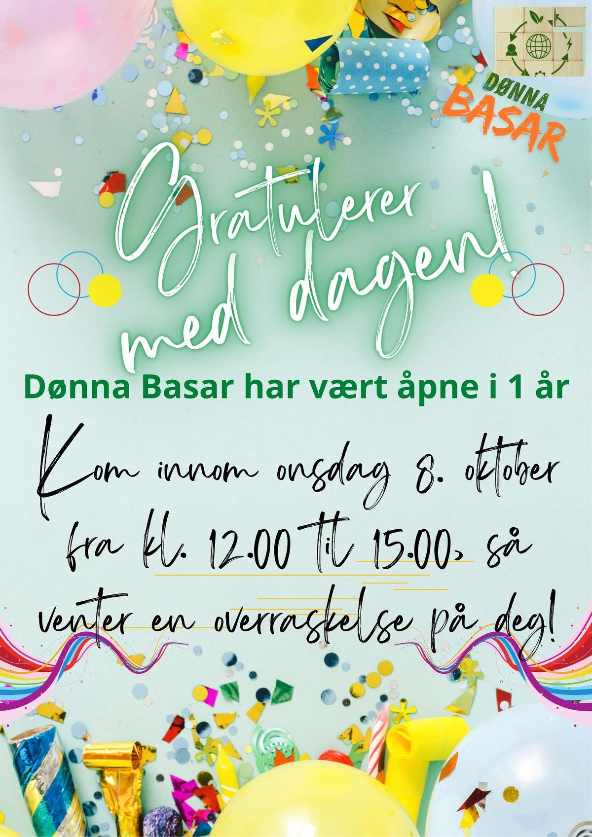 Vi feirer 1 år Dønna Basar med kaffe og kake og 50% salg!